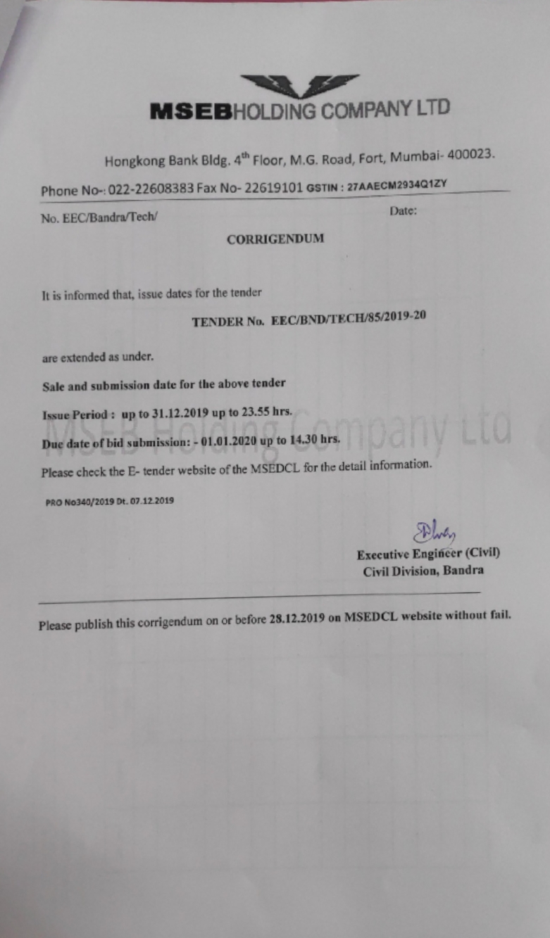 Corrigendum to tender EEC/BND/TECH/85/2019-20 floated under Civil Division Bandra